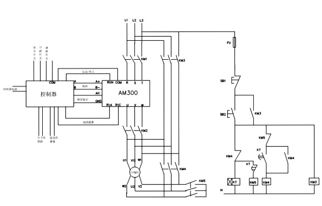 其中KM1、KM3為工變頻切換接觸器,控制器選用普勒特,變頻器選用安邦信AM300系列。變頻器與控制器的鏈接:R485通訊,開關(guān)量控制變頻器啟停,模擬信號(hào)控制變頻器速度,變頻器故障信號(hào)反饋等。